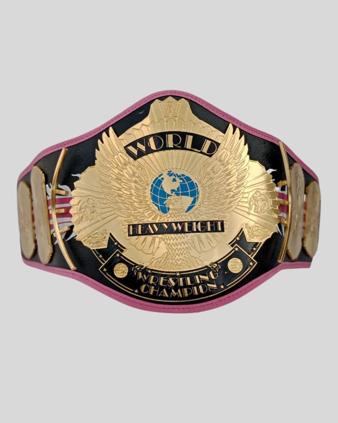 Pay tribute to “The Excellence of Execution” with this Bret Hart Signature Series WWE Title. Featuring brass heavyweight plates, eagle-winged artwork, and his signature pink strap with zebra flair—crafted for collectors, fans, and legends alike.
