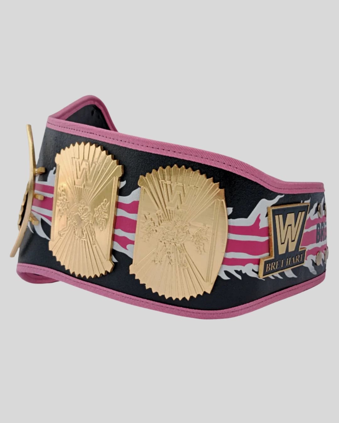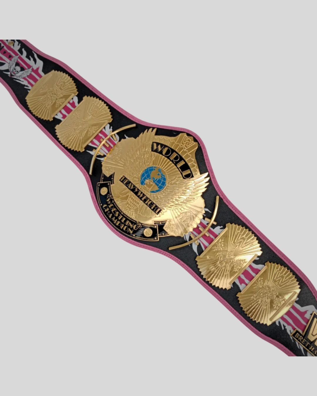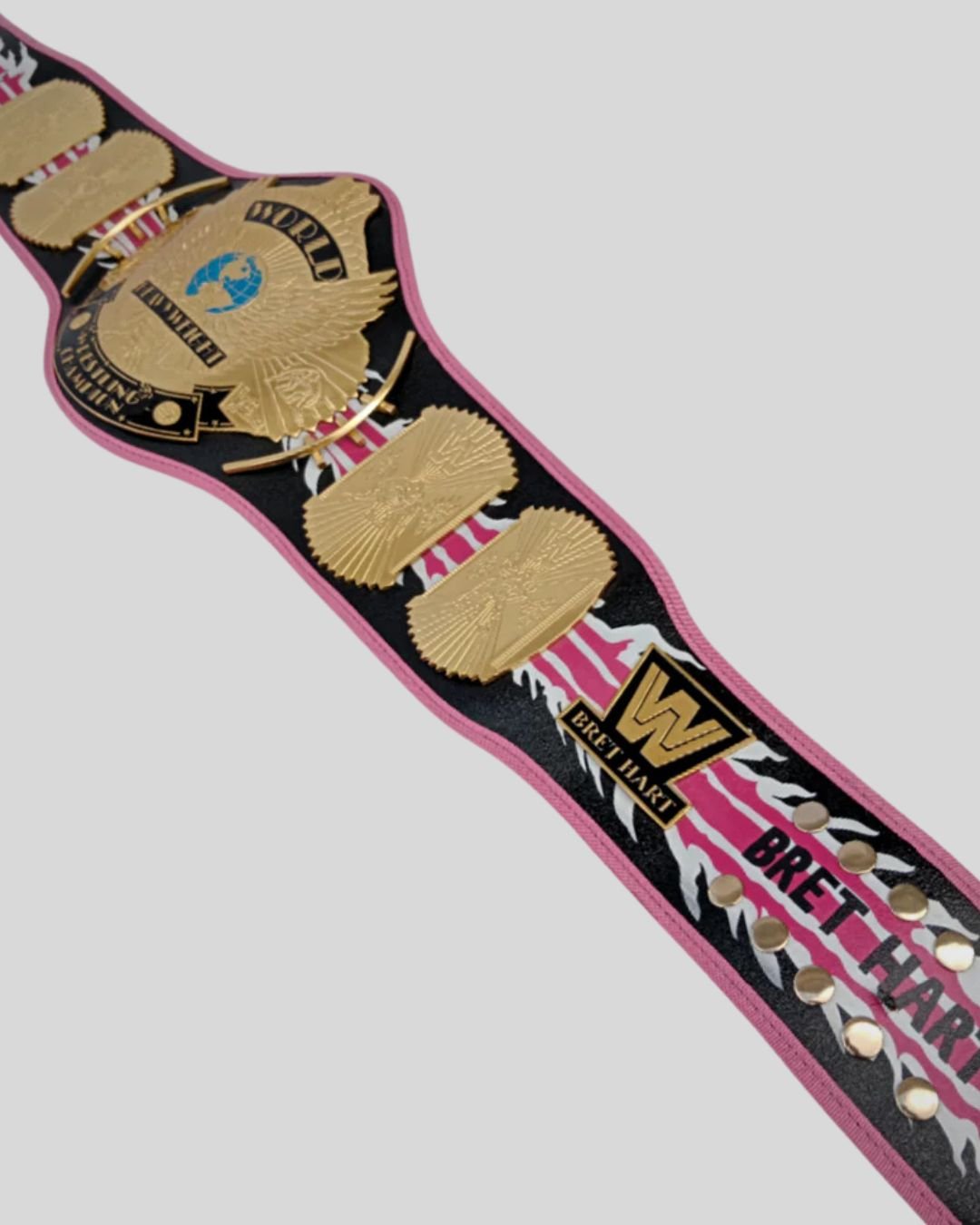 The centerpiece proudly displays “World Heavyweight Wrestling Champion” beneath a globe and eagle wings, just like the titles held during Bret Hart’s dominant era. Side plates mirror the bold gold finish, while the back features his name, pink flame zebra layout, and custom gold W-Bret Hart emblem.