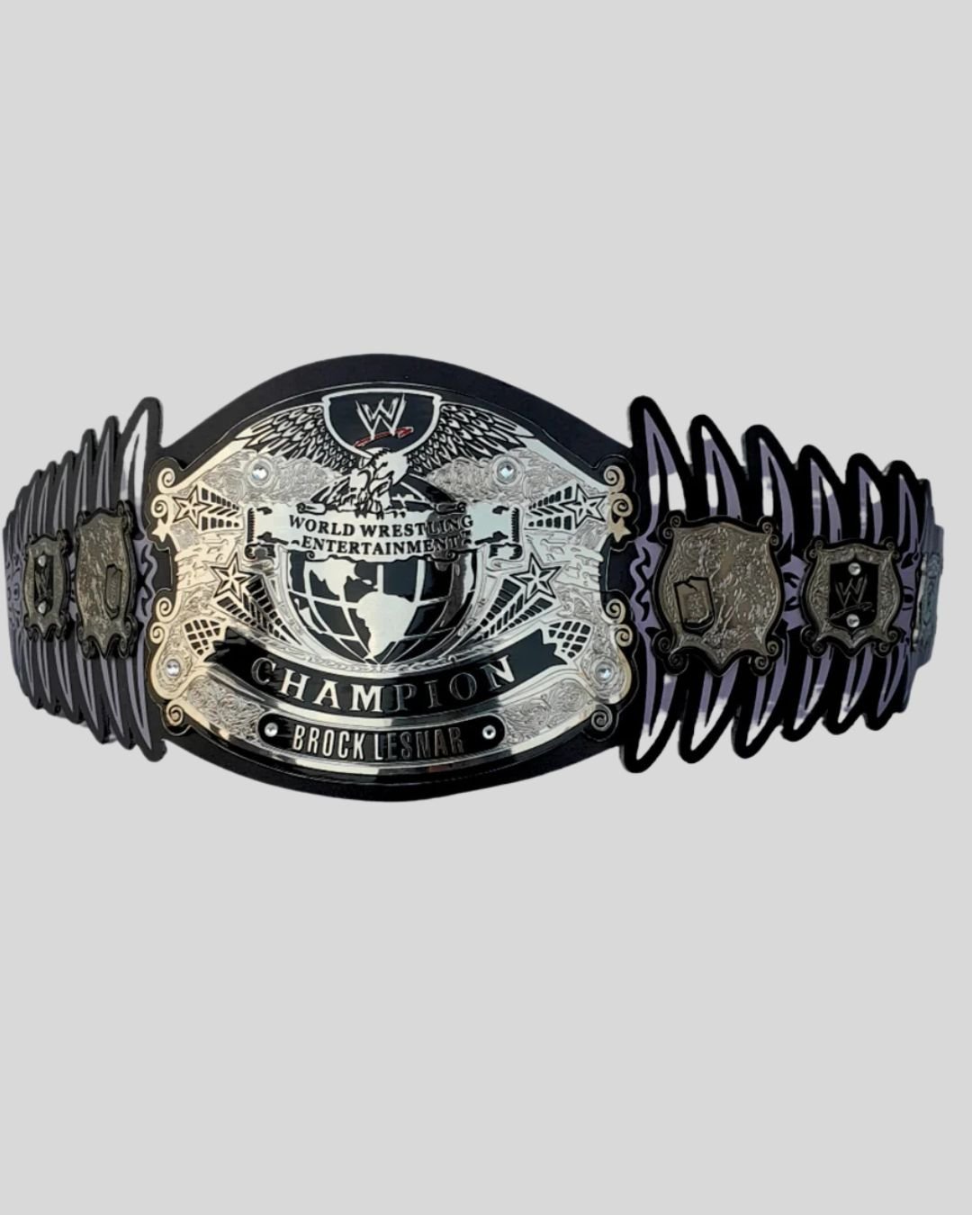 Center Plate: Globe design with eagle wings and “World Wrestling Entertainment Champion” engraving