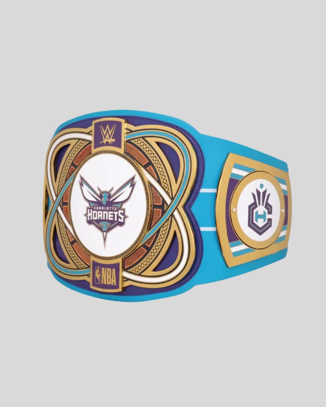 Buzz into fandom glory with the Charlotte Hornets WWE Legacy Belt, crafted with teal leather, bold brass plates, and the team’s iconic hornet logo.