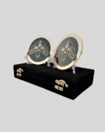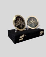 This Bray Wyatt side plate set features his signature moth emblem in a gold-on-black finish, crafted from premium brass metal. Each plate measures 4.25” x 3.16” and fits most belt designs. The set includes a velvet storage box and display stands. CNC, enamel, and engraving options are available for full customization.