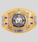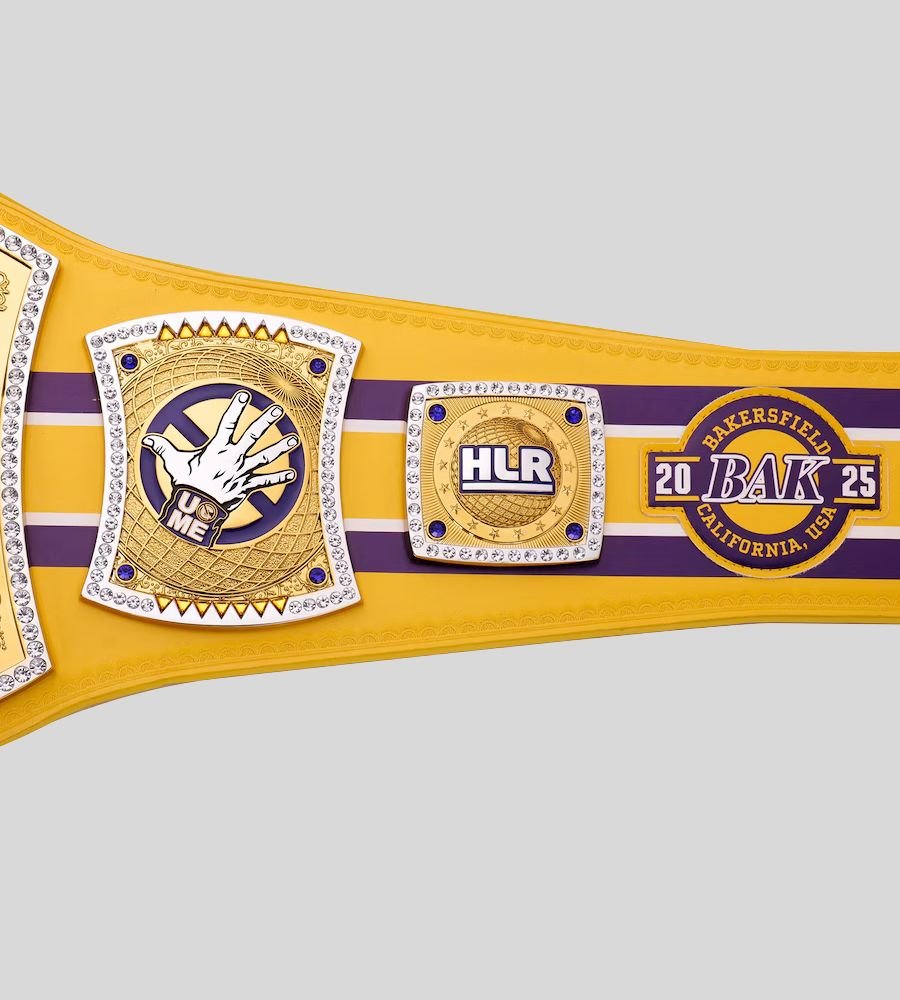The John Cena Farewell Championship Belt 2025 pays tribute to one of WWE’s greatest superstars of all time. Designed with Cena’s signature purple and yellow color scheme, this belt features a bold brass-plated centerpiece with Cena’s portrait, the “Never Give Up” and “Rise Above Hate” side emblems, and the slogan The Champ is Here. With detailed crystal-studded accents, golden eagle top plate, and Farewell Tour 2025 engraving, it’s a collector’s piece made for true fans.