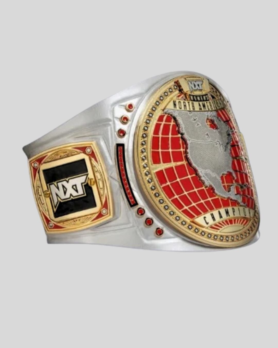 Own the moment with the NXT Women’s North American Championship Belt – 2024’s standout title with a powerful silver map center, red grid globe background, and gold accents. A belt built to honor the continent’s fiercest competitors.
