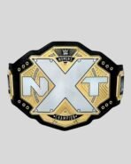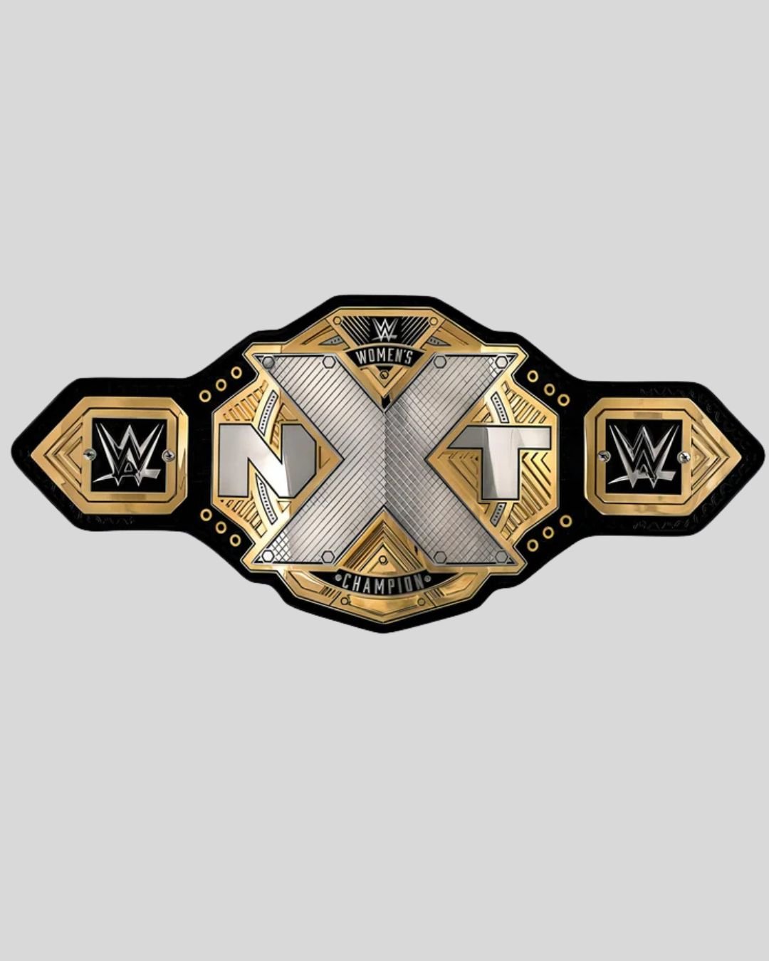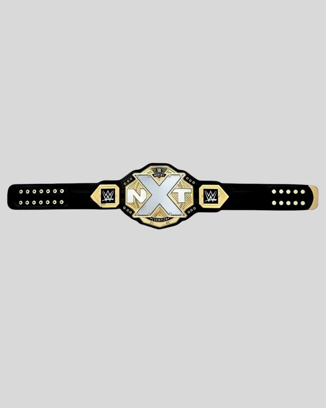 The belt includes black side plates with WWE logos, bold geometric shapes, and layered patterns that reflect the energy of the NXT brand. Its sleek silhouette and championship-grade detailing make it ideal for display, entrance gear, or fan photoshoots.