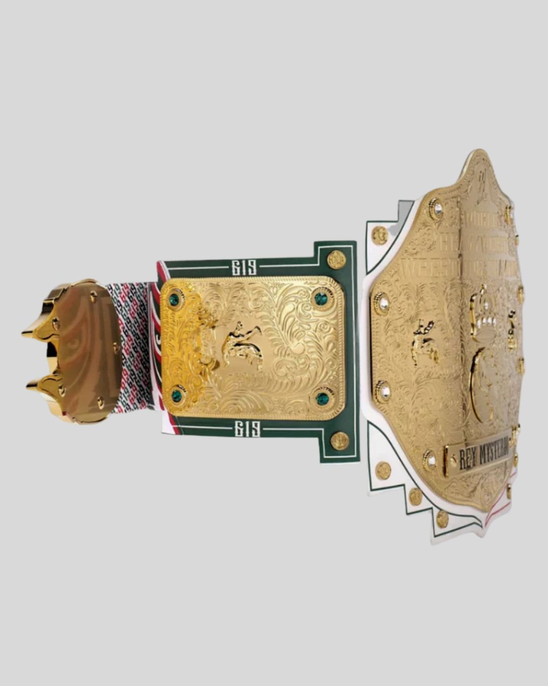 Honor the legend of lucha libre with the Rey Mysterio Signature Series WWE Belt. Featuring the Big Gold brass plate, Mexican tricolor strap, and 619 custom backprint, this collectible captures Mysterio’s high-flying legacy in championship form