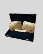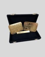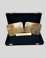 This Ric Flair WCW side plate set features rectangular brass inserts with gold detailing and signature red jewels. Sized at 4.25” x 3.16”, they fit most custom wrestling belts. The set includes a matching engraved Ric Flair nameplate and arrives in a velvet box. CNC upgrades and custom options available for collectors.
