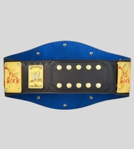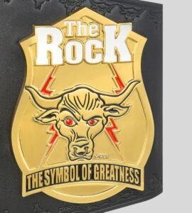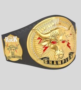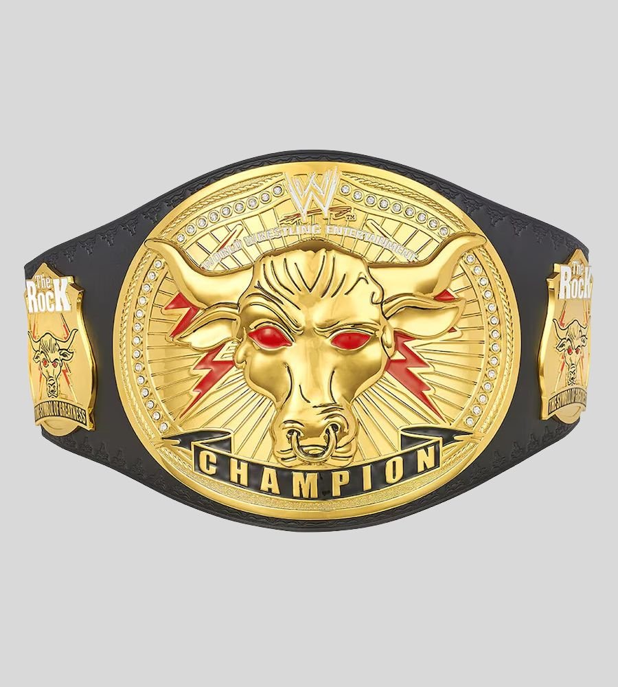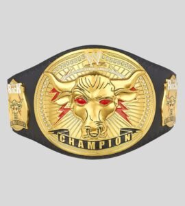 Celebrate the legacy of The Great One with the WWE The Rock Brahma Bull Championship Belt. Featuring the iconic Brahma Bull centerpiece with red eyes, golden side plates, and bold “Champion” banner, this title is a collector’s dream. Built with a durable leather strap and customizable options.