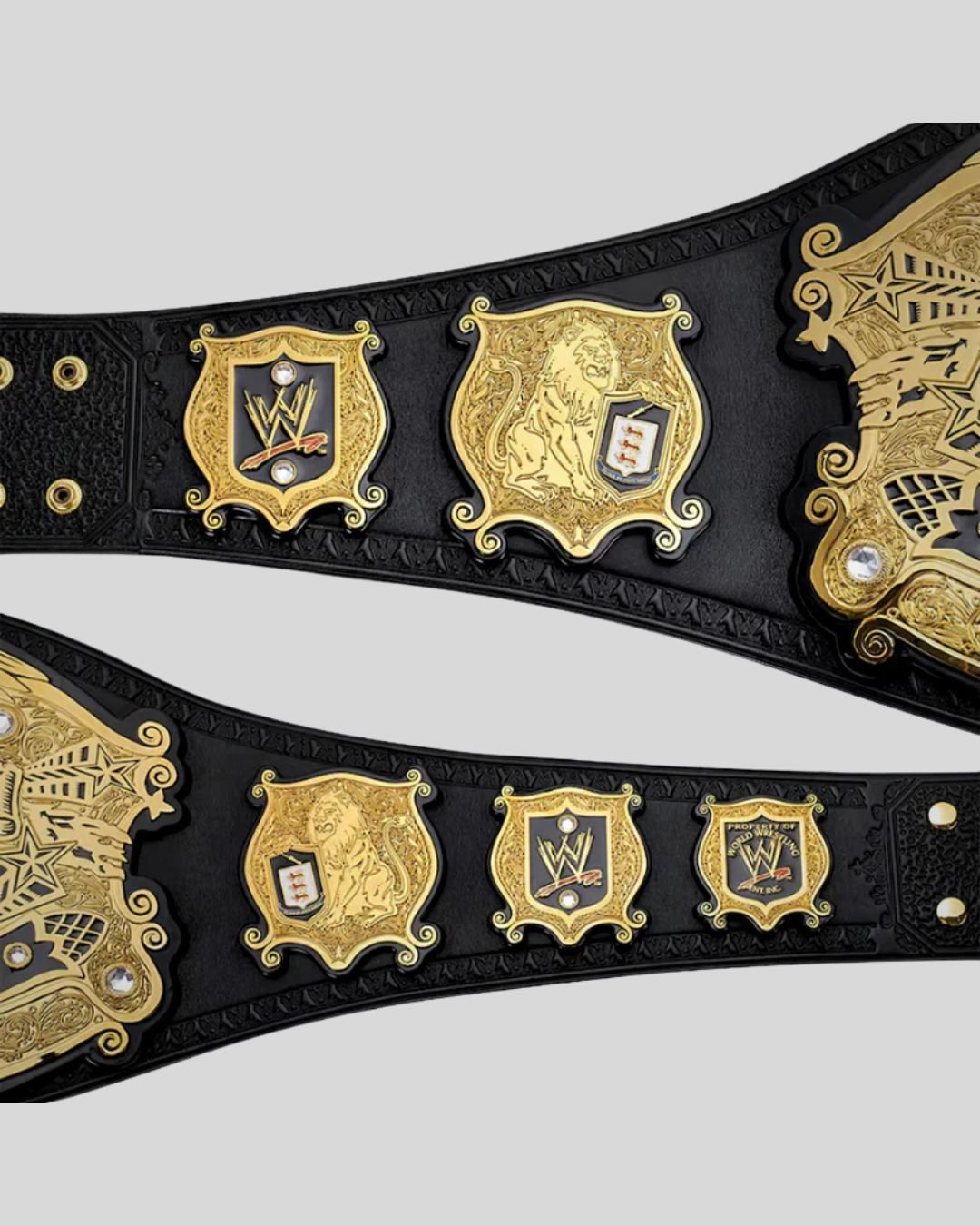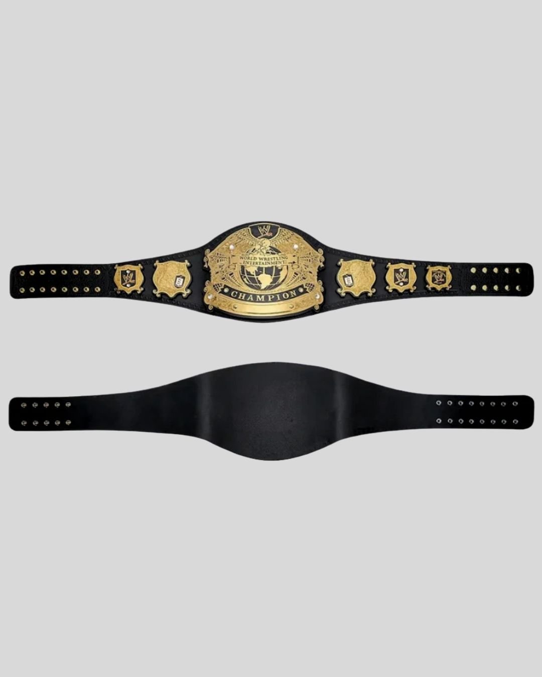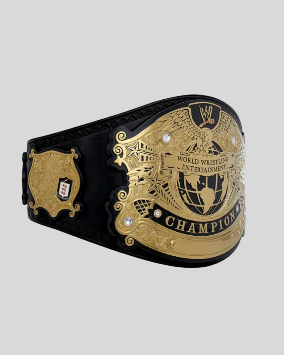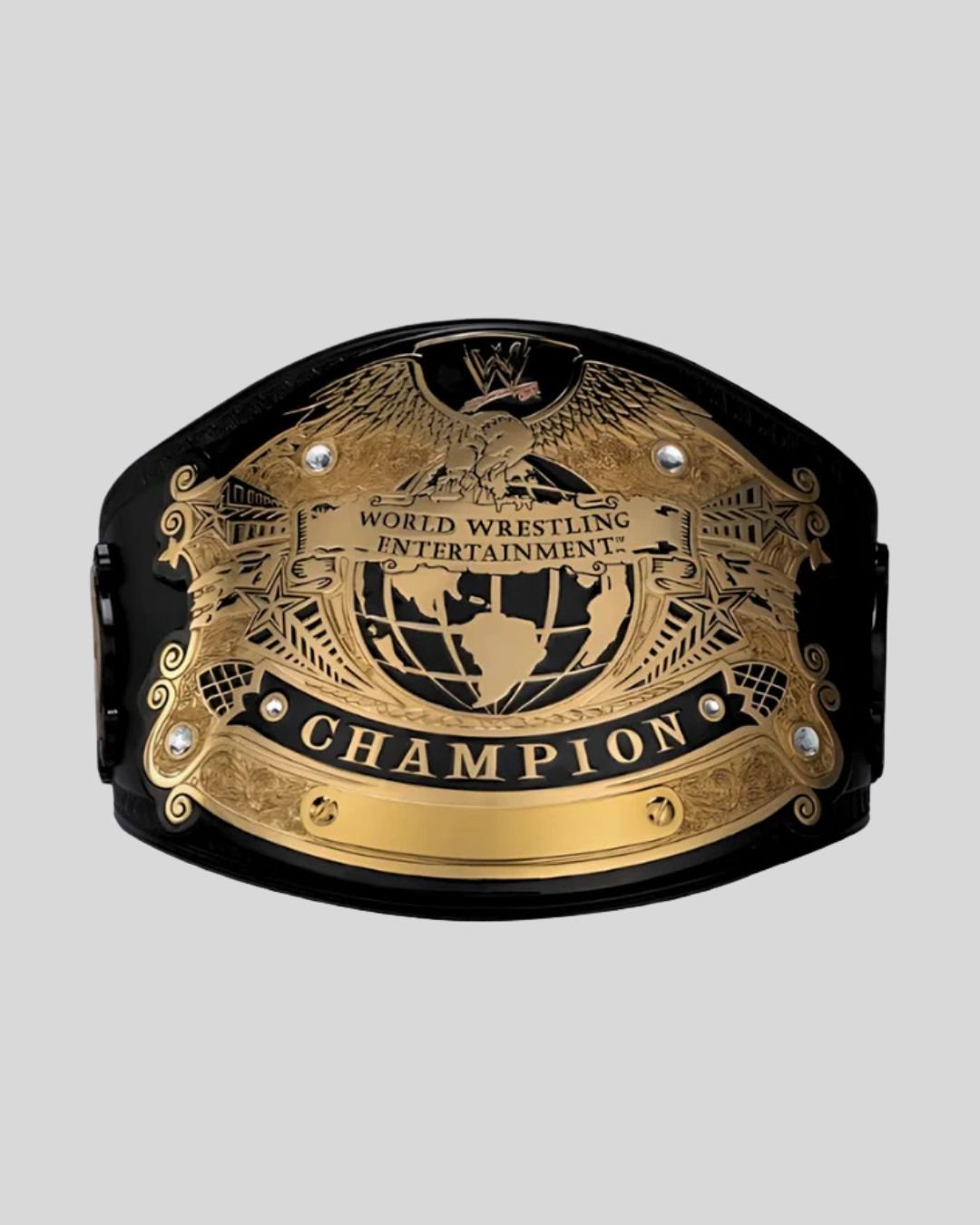 Honor the era of unified champions with the WWE Undisputed Championship Belt 2001. This collector’s edition title features a world globe centerpiece, eagle-wing detailing, and classic brass plates mounted on a handcrafted black leather strap. A legendary piece for serious fans.