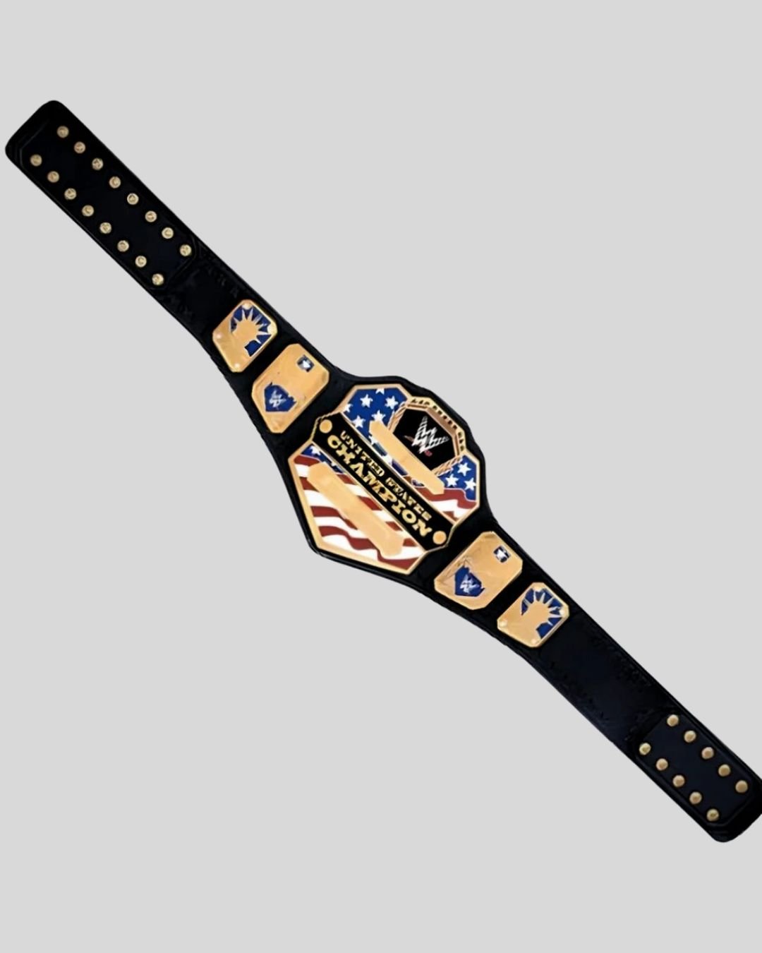 Show off your patriot pride with the 2015 WWE United States Championship Belt. This title features American flag art, gold brass plating, and bold typography across a sleek black leather strap—an essential collector’s item from the Ruthless-to-Modern transition era.