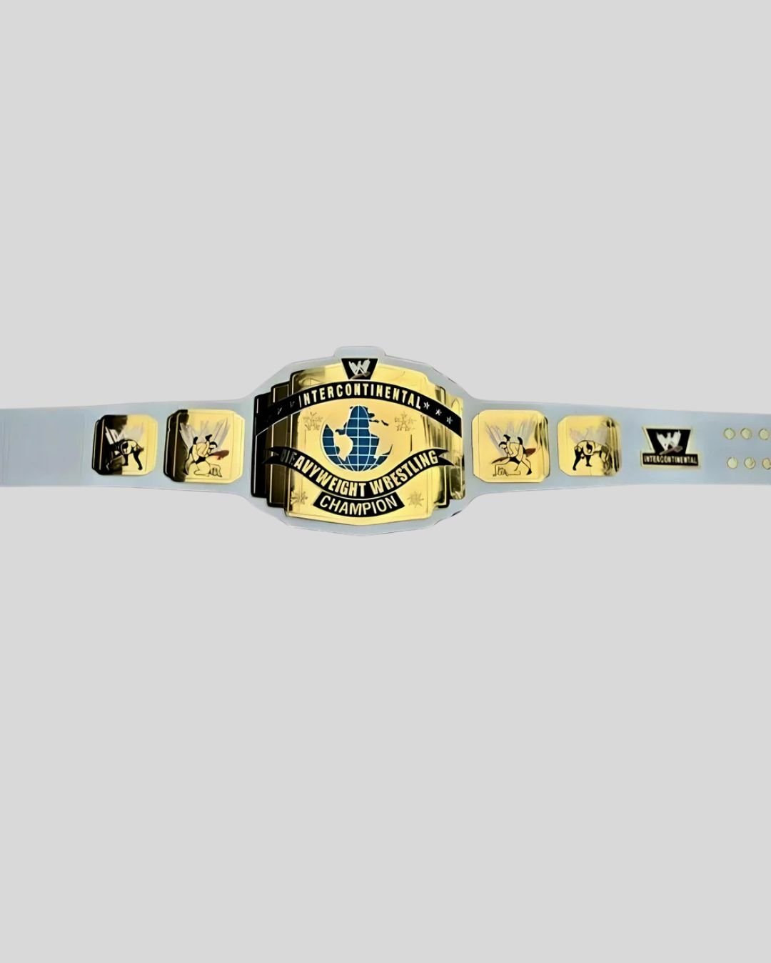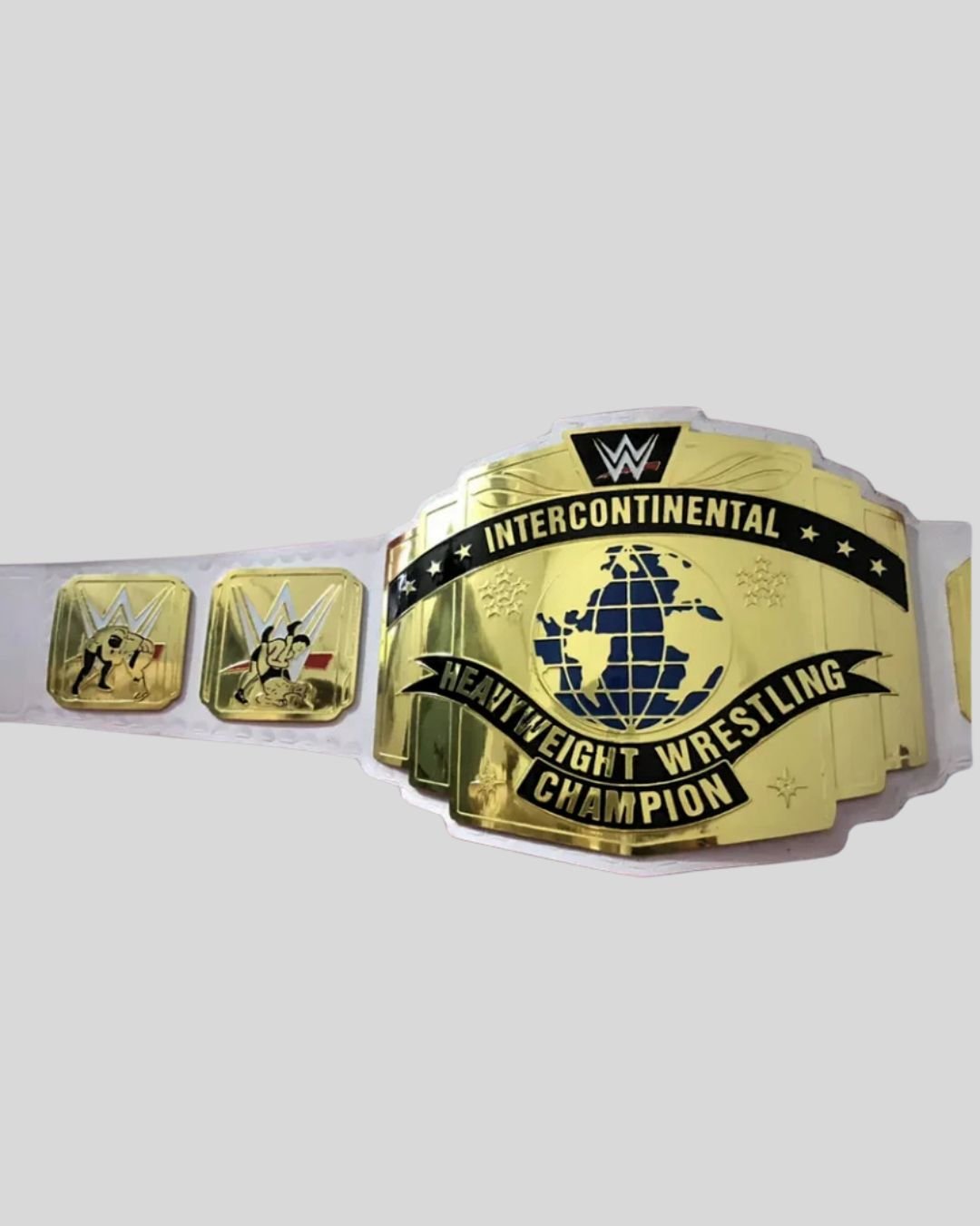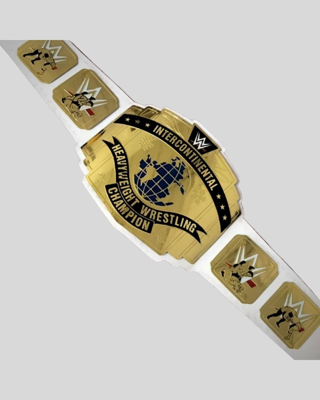 Celebrate timeless WWE history with the White Intercontinental Championship Belt. Featuring a golden brass plate with a vibrant blue globe and set on a crisp white leather strap, this collector’s piece pays tribute to legendary midcard reigns of the 80s, 90s, and beyond.