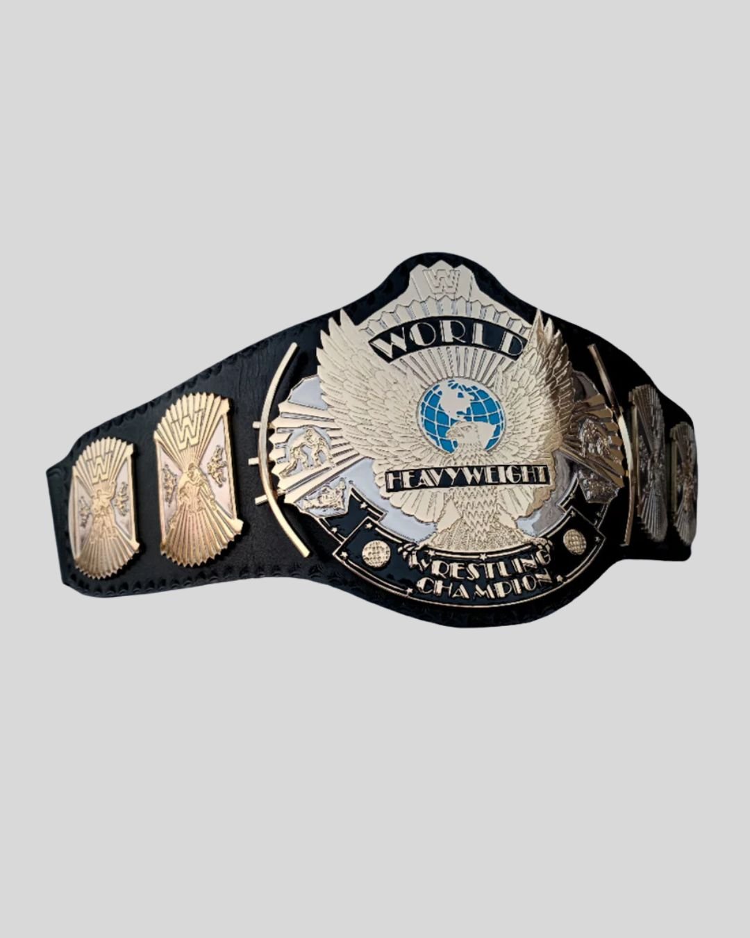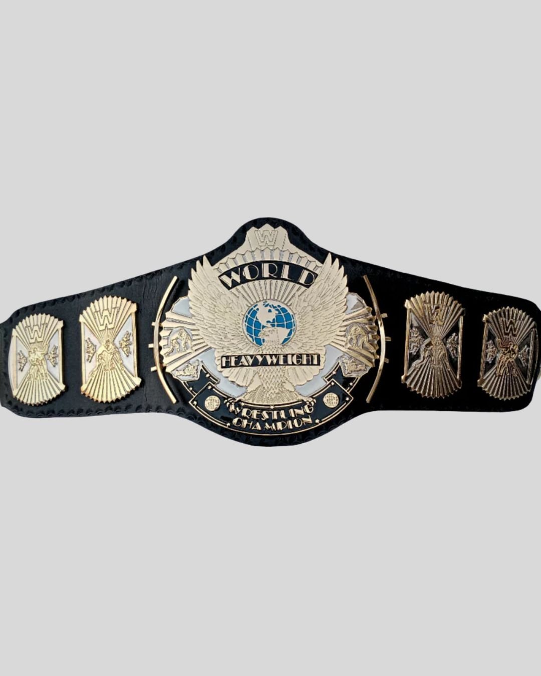Step into wrestling royalty with the WWE Winged Eagle Championship Belt. Featuring dual-plated brass detailing, a soaring eagle above a blue globe, and premium black leather, this heavyweight title pays tribute to the legends of WWE’s golden era.
